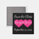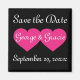 I Spara datum magneter finns ett par shock rosa som är täckta av malltext för namnen på bruden och brudgummen. Malltexten "spara datumet" visas ovanför hjärtan och ett malldatum visas nedan. Utformningen kan anpassas för en förlovningsfest, möhippa, repetitionsmiddag, bröllop, årsdag eller valentins spara i party eller festtjänst.