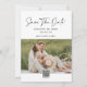 Det här redigerbara sparandet av datummallen är ett modernt meddelande om svartvita foton från bröllop med minimalistisk typografi, perfekt för par tittar för en snyggt och enkel att anpassa design.
