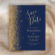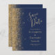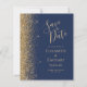 Det moderna bröllop spara datum-kortet från elegantens lämnat kant har ett guld faux glitter gräns. Anpassadet kombinerar handskrift, rityta och kursivt typsnitt i blek guld-färgad med en marin blå bakgrund. Den omvända sidan har en matchande marin blå och guld-design.