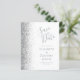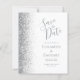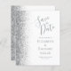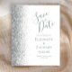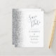 Det moderna bröllop spara datum-kortet från elegantens lämnat kant har ett silver faux glitter gräns. Anpassadet kombinerar grått-handskrift, tryckplåt och kursivt typsnitt på vit bakgrund. Den omvända sidan har en matchande vit- och silver-design.