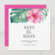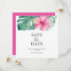 Den här födelsedagen sparar datumkorten och har en övre gräns för tropiska blommor med elegant och löv med monstera handflatan. Orden "Spara datum" är typset i grått från kol över en skarp vit bakgrund. Använda mallens fält för att lägga till anpassningsbar. Kortet återgår till en matchande vibrant rosa färg. Kan användas för en söt 16, 40:e, 50:e, 60:e födelsedag...eller någon ålder. Om du vill se hela födelsedagstemat går du till www.zazzle.com/dotellabelle Unik vattenfärgsfärgskonst och design av Victoria Grigaliunas.