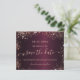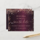 Ett modernt Spara datumkort för en 50:e (eller någon annan födelsedagsfest). En burgundisk bakgrund färg. Dekorerad med ro guld faux-glitter. Texten: Spara datumet skrivs med ett stort trendig-handskript i stil.
