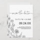 Denna eleganta elegans som sparar datumkortet är perfekt för ett minimalistiskt bröllop. Blommigtens design har en enkel och elegant arrangemang av delikata svarta och vita vilda blommor parade med ett romantiskt kalligrafteckensnitt.