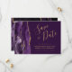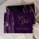 Den här eleganten är modern när du sparar datumkortet och har en lila vattenfärg som går upp i gräns och trimmas med faux guld glitter. Anpassadet kombinerar handskriftsskript guld-färgad, tryckplåt och kursivt typsnitt på en rik plumbakgrund. Den omvända sidan har en matchande lila- och guld-agate-design.