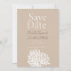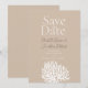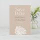 Minimalistiskt bröllop spara datum-kort med elegant taupe färg och vithavskorallsilhuetdesign.