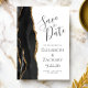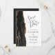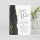 Det moderna bröllop spara datum-kortet från elegantens lämnat kant har en svart vattenfärgad agate gräns som trimmas med faux guld glitter. Med anpassadet kombineras grått-handskrift, tryckplåt och kursivt typsnitt på vit bakgrund. Den omvända sidan är solid off-black.
