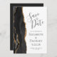 Det moderna bröllop spara datum-kortet från elegantens lämnat kant har en svart vattenfärgad agate gräns som trimmas med faux guld glitter. Med anpassadet kombineras grått-handskrift, tryckplåt och kursivt typsnitt på vit bakgrund. Den omvända sidan är solid off-black.