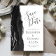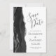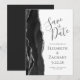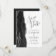 Det moderna bröllop spara datum-kortet från elegantens lämnat kant har en svart vattenfärgad agate gräns som trimmas med faux silver glitter. Med anpassadet kombineras grått-handskrift, tryckplåt och kursivt typsnitt på vit bakgrund. Den omvända sidan är solid off-black.