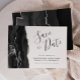 Den här eleganten är modern för att spara datumkortet och har en svart vattenfärg som ruttnar gräns med faux silver glitter. Anpassadet kombinerar handskriftsskript, mönsterplåt och kursivt typsnitt i grått i kol mot vit bakgrund. Den omvända sidan har en matchande svartvit och silver agate-design.