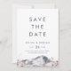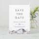 Det här enkla berget med blommigt sparar datumkortet är perfekt för ett utomhus bröllop. Den moderna minimalistiska utformningen har ett marint, blått vattenfärgsberg med rosa moody snäckor.