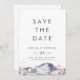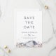Det här enkla berget med blommigt sparar datumkortet är perfekt för ett utomhus bröllop. Den moderna minimalistiska utformningen har ett marint, blått vattenfärgsberg med rosa moody snäckor.