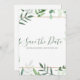 Tittar för en elegant och chic-spara-till-datum-inbjudan till vår eller sommar-bröllop? Titta bara på vår fantastiska botaniska design! Den här inbjudan är perfekten för att ange tonen för din speciella dag och har en ljust grönt bakgrund med delikat grönt löv och grenar. Uttrycket "Spara datumet" skrivs ut elegant i skript för grönt på en skarp vit bakgrund, vilket lämnar mycket utrymme för att du ska kunna anpassa med dina egna uppgifter.