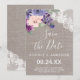 Om du sparar datumkortet i lila blommor och snöre är det perfekt för ett landsbyggsbröllop. Den roliga chicen har en vacker arrangemang av blommor av lila, lilak och rosa med vit blommigt snöre på en elegant linen bakgrund.