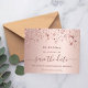 Ett giftigt och trendig Spara datumkortet för en 50:e (eller någon annan ålder) födelsedagsfest. En feminin rosa, ro guld-bakgrund som dekoreras med guld-stjärnor från ro. Anpassa och lägg till datum och namn/ålder 50. Mörk ro guld färgad brev. Texten: Spara datumet skrivs med ett stort trendig-handskript i stil.