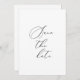Spara det platta datumkortet formellt. Svart typografi på vit bakgrund med detaljer på baksidan. Kimberly Brett.