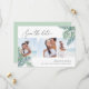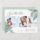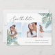 Meddela din sommar-, destination- eller strandbröllop med den här tropiska chicen spara datumkorten med tre kvadratiska foton som är placerade sida vid sida. Tropiska handflatan-löv i gröntens vattenfärg visas i hörnen, med "spara datumet" och dina bröllop-detaljer i en elegant blandning av modernt handskript och traditionell serif-typografi.
