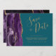 Den här eleganten är modern när du sparar datumkortet och har en lila vattenfärg som går upp i gräns och trimmas med faux guld glitter. Anpassadet kombinerar handskriftsskript guld-färgad, tryckplåt och kursivt typsnitt på en helblå bakgrund. Den omvända sidan har en matchande lila- och guld-agate-design.