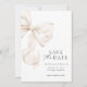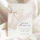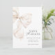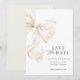 Elegant Ivory Bow Spara datumkortsmeddelandet speciell dag i stil med det här sofistikerade "Spara datum"-kortet med ett vackert illustrerat elfenbensmatarbun. Utformningen kombinerar en tidlös palett i neutralt färg med modern typografi, vilket skapar en lyxig och romantisk känsla.