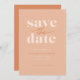 Den här moderna persiko-färgaden sparar datumkortet med ord "spara datumet" skrivet i en blandning av serif och script typsnitt och har gott om utrymme för namn samt datum och plats för bröllop.