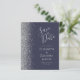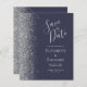 Det moderna bröllop spara datum-kortet från elegantens lämnat kant har ett silver faux glitter gräns. Med anpassadet kombineras handskrift, tryckplåt och kursivt typsnitt med silver grått mot en mörk blått bakgrund. Den omvända sidan har en matchande design i blått och silver.