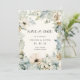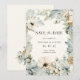 Denna moderna boho-vinter i spara datum meddelande har vackra, handmålade vattenfärger dammiga blå löv och bär, krämanemonblommor, sage greenery och pinekonomier som arrangeras som snyggt ram på ett elfenben | gräddbakgrund. Baksidan innehåller en underbar bukett och monogram. Sök efter matchande objekt i Winter Dusty Blue Blommigt Bröllop Collection.