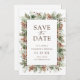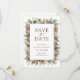 Den här eleganten har spara datum meddelande-kortet handmålat vattenfärgsgrönt och pinekonar arrangerade som en vacker andedräkt. Texten är brun och bakgrunden vit. I baksidan finns en snyggt bouquet. Hitta matchande objekt i Pinecone- och Greenery-Helgdag.