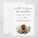 Bröllop spara datum-kort med Chow hund och jokerblommor. Modern och minimalistisk text med namn överst, numeriskt datum och plats för händelsen. Texten är brun med datum i kolonialblått. Gör enkelt ändringar med hjälp av verktyg.