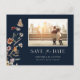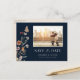 Blommigten för marint blåfoto sparar vykortet för datum. Den här snyggt- och eleganten-fotot med vykortet Spara datum meddelande har en fantastisk, handmålad, vattenfärgad jokerblomma i en underbar bukett-perfekt. Sök efter matchande objekt i samlingen Navy Blue Boho Wildblomma Bröllop.