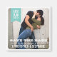 Modern, men med ett rostiskt fläkt fyller ett foto av det vackra paret ram, och en trendig-teal banderoll håller i månaden, dagen och året efter bröllop-datumet. En magnet för perfekt som ger gästerna information om förlovningen och datumet i bröllop.