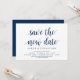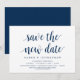 Ändra datum kort. Det här är bröllopsinbjudan omdatumierad (uppskjuten / uppskov) kort (Spara vårt nya datum), i modern minimal enkel ren design med marinblå font.