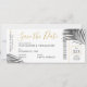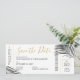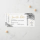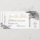 Tropisk löv i handflatan (fronder) på ett enkelt, modernt och minimalt utformat boardingkort i flygplan biljett sparar perfekten med datumkort för ett bröllop på strand eller ett tropiskt öresbröllop med chic återmodern svart och vit med temaestetik i guld träd. All text kan vara personlig, text och bakgrund färg. Klicka på ANPASSA YTTERLIGARE om du vill göra detta i den avancerade redigeraren.
