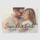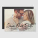 Säg bröllop till familj och vänner! Den här moderna bröllop spara datum-annonsmagnetdesignen har ett vågrät foto av det engagerade paret på framsidan med ett vitt, borstat "Spara our Date"-kalligrafiskript som täcker över och ett monogram av brud och groom namn och bröllop-datum som kan vara personlig. Observera att den vita texten färg kan ändras.