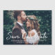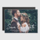 Säg bröllop till familj och vänner! Den här moderna vågrät med annonskort i bröllop spara datum har ett foto av det engagerade paret på framsidan med en vit "Spara our Date"-kalligrafiskript som täcker över och ett monogram av brud och groom namn och bröllop-datum som kan vara personlig. Observera att den vita texten färg kan ändras.