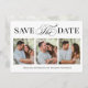 Den här designen sparar datumfotokortet, perfekt för bröllop, med ett modernt minimalistiskt stil, med en enkel svart-vit, elegant, typografi, calligraphy-skriptdesign, en fyra fotokollage-mall, en klassisk design.