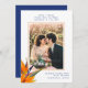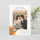 Ett foto sparar datumet med orange av paradisblommor. Vita kort med mörk blått, handtryckt teckensnitt. Anpassa ordalydelsen överst och grund. En tunn linje ram runt lodrät bild av paret får den att framstå på ett minimalistiskt sätt. Exotiska blommor dekorerar grund, lämnat hörn med en ordalydelse som är anpassad till högerna.