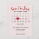 "Spara datum"-kalendern med rött hjärta på rosa hjärtbakgrund för kommande bröllop. Text kan redigeras. Månaden kan ändras. Ställe det röda hjärtat på dagen för er bröllop-dejt.
