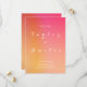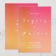 Det här är ett modernt, minimalt, Spara datumkortet/-inbjudan för Bröllop. Den finns i övertoning för summerad shock rosa och orange/färg med elegant vit typografi/skript. På framsidan står det "Spara datum", med utrymme för parets namn, datum, plats och utrymme för mer information i bröllop. På baksidan står det också "Spara datumet", med utrymme för parets initialer och datum i bröllop. Den här minimala och summerade designen är perfekt att låta dina vänner och familj få veta om din bröllop-dejt innan de skickar sin bröllopsinbjudan till dem. Om du vill anpassa dig skriver du bara dina uppgifter, plats, datum och initialer i textrutan för att anpassa den. Här kan du också ändra resten av texten om du vill. Om du vill ändra färg eller teckensnitt checkar du ut verktyg för designredigering. Om du behöver hjälp med att anpassa dig eller om du behöver hjälp med anpassad design kontaktar du mig via zazzle-chatta eller e-post: ursuladawnmoon@gmail.com
