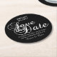 Spara datumet underlägg anpassningsbar designad champagnedamm med svart övertäckning och guld spara datumtypografin. Personlig med inspirerande citat av hur paret träffades. "Vi hittade varandra inte av en slump, utan genom att skapa känslan som om." Ett unikt sätt att meddela din bröllopsdag som kan anpassas till ditt party-tema.
