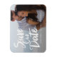 Med modern kan du spara datumdesignen som innehåller orden "spara our date" i ett penselvitt, handskript med ett foto av paret lycklig som visas bakom. Vit övertäckning och bröllop kan placeras var som helst på kortet.