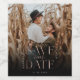 Modern och minimal spara vår datumfoto sparar datummärket vin. Designen har ett modernt foto för att visning ditt eget speciella foto. "Spara our Date" visas i en modern faux ro guld-folie med typografi med namn och ett nytt bröllop-datum. Den svarta övertäckningen av övertoningsfotot ger ett lyxutseende.