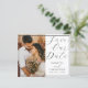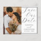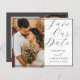 Starta planeringen i bröllop i stil med den här eleganten och spara datumkortet minimalistiskt. Med ett stort, tidlöst skript "Save the Date" i mörk grått på en skarp vit bakgrund innehåller den här designen en anpassade fotomall - perfekt för att visa förlovningen bild. Perfekt för moderna, klassiska eller romantiska bröllop teman. Fullständigt redigerbart för kostym med dina unika detaljer och skapa ett bestående första intryck.