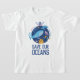 Sprid medvetenhet om skyddet av våra hav och marina liv med denna vackra t-shirt med en illustration av vår planet med havsdjur (val, havssköldpadda, bläckfisk, fisk, korall och krabba) med anpassadet "Spara våra oceaner" i ett blått, absolut typsnitt