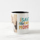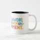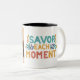 "Tvåtonskaffe Mugg A färglös typografisk design med det motiverande citatet "SAVOR EACH MOMENT" omgivet av dekorativt löv-liknande inslag på mörkens bakgrund. Användan av vibrerande färg och konstnärliga förskönanden gör denna bild visuellt tilltalande och inspirerande.