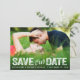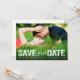 Vykortsmeddelande om ditt bröllop-datum. Använda fullt med vågrät "Spara our Date" över fotot. En svart övertoning visas grund på kortet för att texten ska stå ut. Om du inte behöver övertoningen, ta bara bort den. Anpassa namn och datum fram och tillbaka. Det finns ett annat kort med vit övertoning och tillgänglig mörk.