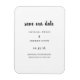 Minimalistiskt spara datum magneter med en enkel men elegant utformning med ord, "spara vårt datum" i ett tjockt svart skript och dina uppgifter nedan, över en vit bakgrund. Texten och bakgrunden kan ändras till valfri färg. En chic och modern utformning för att tillkännage datumet för bröllop i stil.