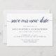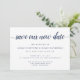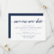 Enkla och eleganta save the date-kort informerar dina gäster om ditt ombokade eller uppskjutna bröllopsdatum. Knapra vita kort har "spara vårt nya datum" i kalligrafisk typsnitt, med era namn, nya bröllopsdatum och plats under i klassisk marinblå serifstil. Lägg till ytterligare information, som er bröllopswebbplats, på baksidan i vit text på en kontrasterande rik marinblå bakgrund.