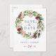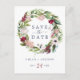 Det tropiska köldkortet spara datum meddelande är perfekt för elegant vår eller sommar bröllop. Blommigtens utformning har röd, burgundisk, rosa och vita blommor på en vattenfärgad tropisk grej med en avslappnad hawaiisk känsla.