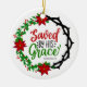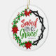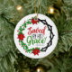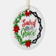 Sparad av hans heliga julfrö, prydnad. Detta prydnadsföremål är perfektens sätt att visa er tro och kärlek för Kristus under julhelgen! Den har en vacker grönt och röd design med ord "sparad av sin nåd" i mitten, omgiven av en vacker röd och grönt julkrans. Detta prydnadsföremål är utan tvekan en konversationsstart och är perfektens väg att er tro med andra!