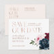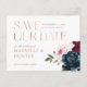 Elegant och modern bröllop spara datum-vykortsdesign med våra färgade vattenfärgblommor i elegant. Vackra fet blommigt med djup burgundi, rik marin blått och nykterheter med accenter av lush grönt sage löv och greenery. Blommigtarna är placerade i vackra bukettarrangemang för att skapa denna djärva och elegant blommigt design. "Spara datumet" visas i en typografisk elegant faux ro guld med detaljerna placerade på ett vackert sätt. Vattenfärgade blommigtar som målats med moodtologi.