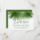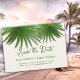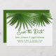 Spara datummeddelandet från bröllop i grönt och vitt. Handflatan fronddesign på vit papper. Anpassa tre textmallar i skuggor med grönt som matchar de realistiska tropiska löven överst på pappra. Moderna skript och typsnitt används.